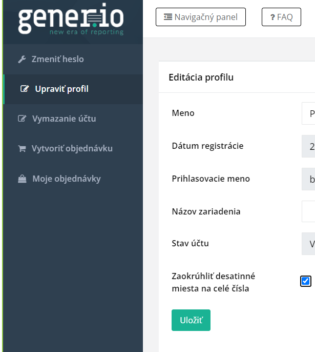 Po prihlásení do webaplikácie gener.io, kliknete hore vpravo na „Môj profil“ a následne vľavo na „Upraviť profil“. Zaškrtnite štvorček „Zaokrúhliť desatinné miesta na celé čísla“.