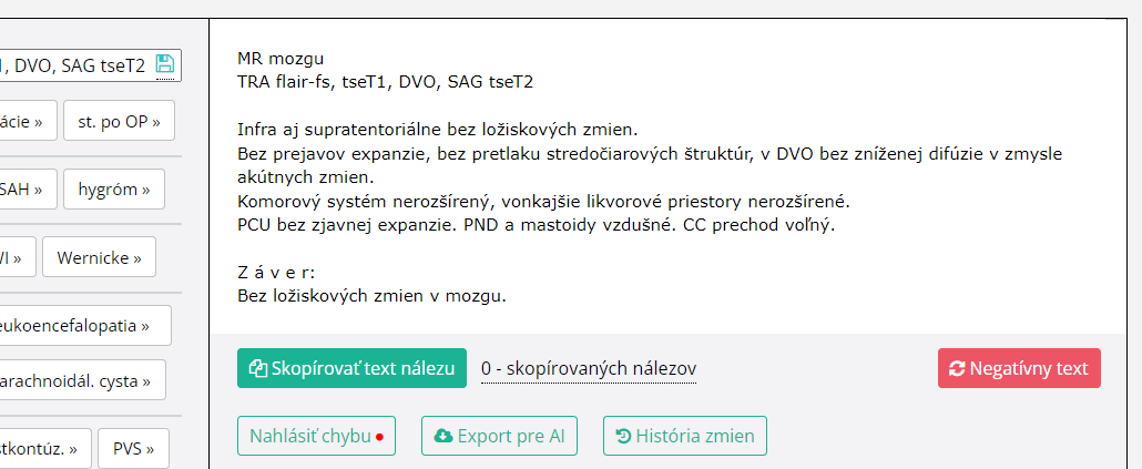 Keď budete hotový a pacient dal na to informovaný súhlas, stlačíte zelené tlačidlo vpravo dole „Export pre AI“, ktoré jednak uloží vygenerovaný popis do schránky (clipboard) a jednak stiahne dočasný súbor, do priečinku „stiahnuté súbory / downloads“.