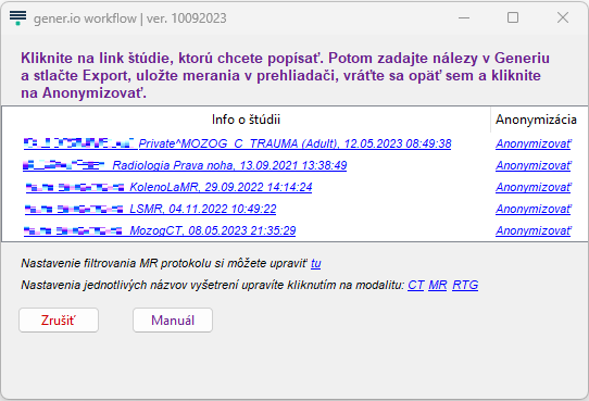 V tabuľke sa nachádzajú štúdie uložené v užívateľom definovanom priečinku v priečinku \localPACS\Settings na domovskom disku. V prvom stĺpci je info o štúdii, ktoré je klikateľné a vyvolá otvorenie webstránky generia s informáciou o ID štúdie, vyšetrovanou oblasťou, prípadne MR protokolom. Neodosielajú sa žiadne osobné údaje.
